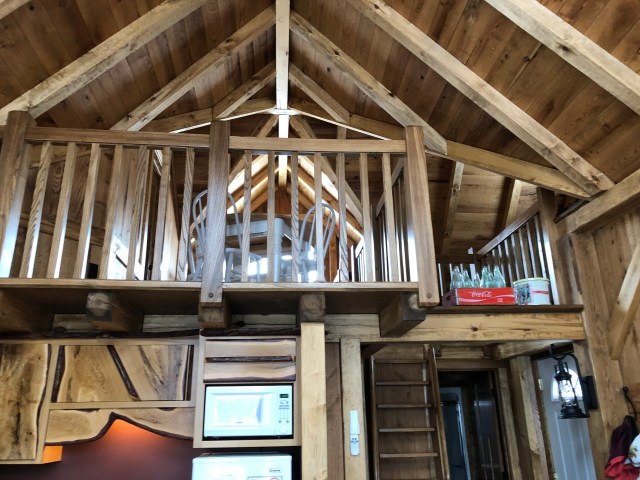 We had an uneventful drive to the treehouse. The roads were actually pretty clear. Aside from some backseat driving, um, I mean navigating, we made it to the treehouse by noon. The snow was falling gently. The treehouse has a covered bridge up to it, so it was accessible for Myles. Once we got settled, Cameron & Dallas put on their boots to trek down to the lake. No fishing gear came along this time, but they wanted to check it out for future trip possibilities. The 850 square foot treehouse is beautiful. Hand crafted cabinets and furniture, big beams and lots of windows made this an impressive cabin.