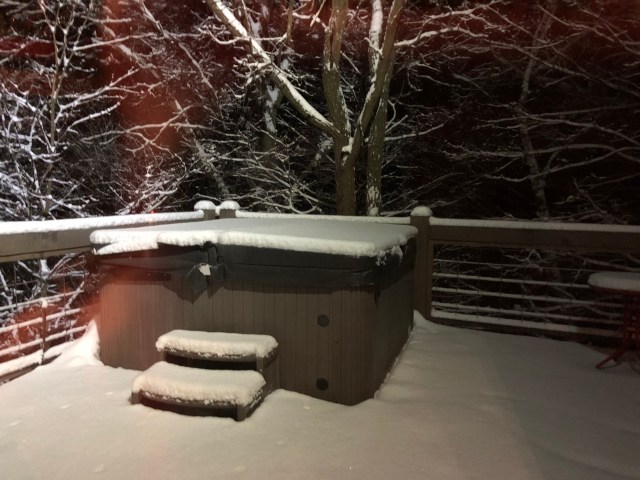 I’d be lying if I said it was a “technology free” stay, but it was relaxing. As the snow continued to fall, we turned the outside lights on to watch. One big circle window at the top was designed with a light above it, so it looks like a snow globe when it’s snowing. We didn’t try the hot tub because that would have been difficult for Myles, but they had one there & the people before us had clearly enjoyed it. I’m sure it would be fun in the snow too!