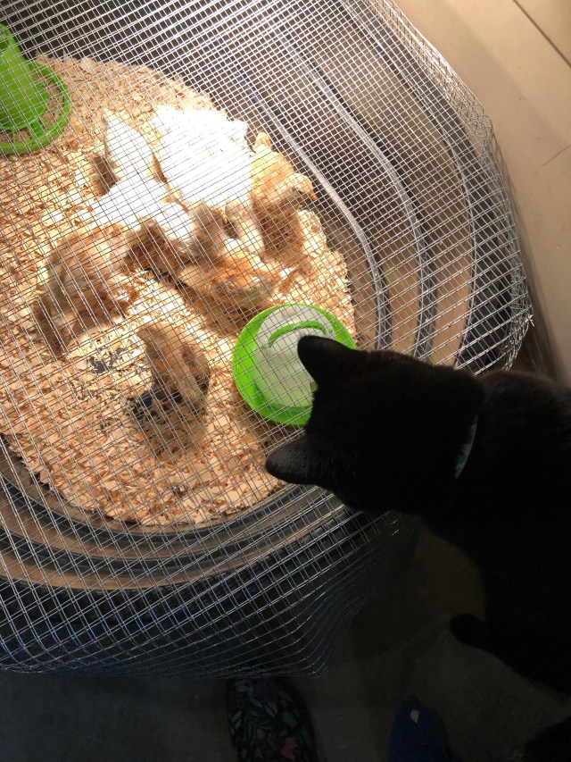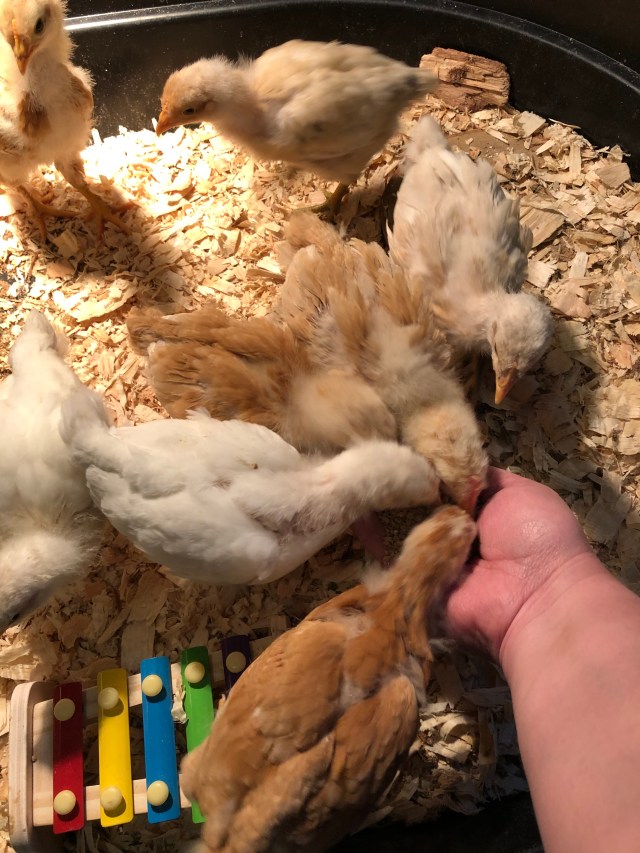It’s actually been better than I thought. The cat has not tried to eat the chickens. He leaves them alone most of the time. Occasionally, he will stare at them from his perch. He has been a little jealous of his chicken garage mates. “Why are they so cute? Why do they get a xylophone?”