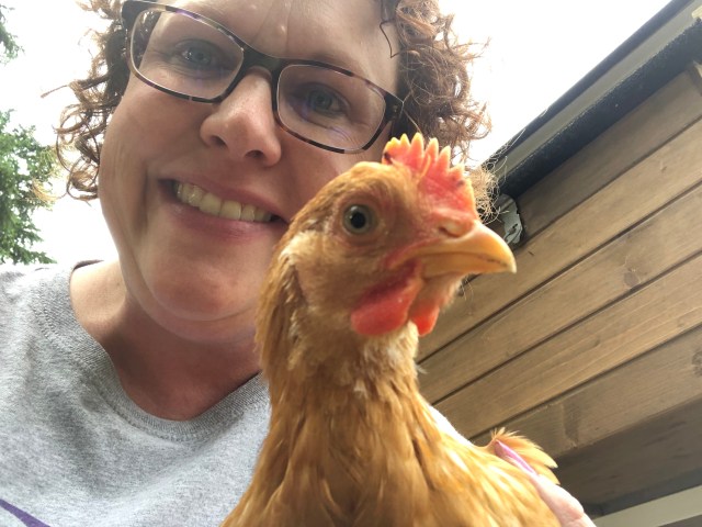 My chickens don’t “bawk” at me posting photos of them. (Ha ha) They don’t care how they look or if a feather is out of place. Nobody will make fun of them. This is Teriyaki in the photo with me. We think she’s a girl but we don’t know for sure. If she starts crowing one day, we will still think “he” is cute and know that he likes clover and loves to sit on your lap.