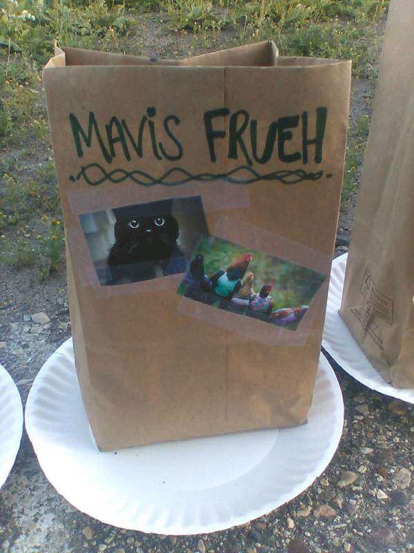 My husband took a picture of the survivor on the back of my shirt. At first I thought it was silly, but it’s one of my favorite pictures of the night. My good friend decorated a bag for me with a cat that looks like ours and some chickens in clothes… perfect. It gets to be in honor of me and not in memory.