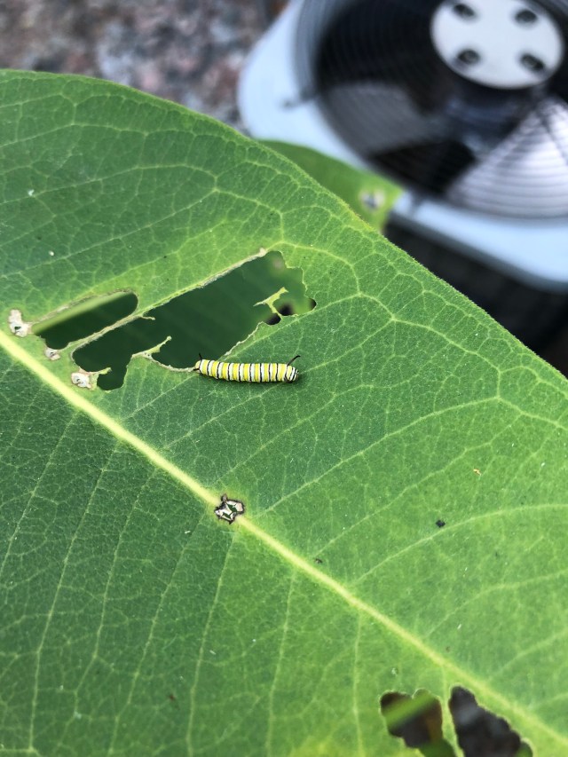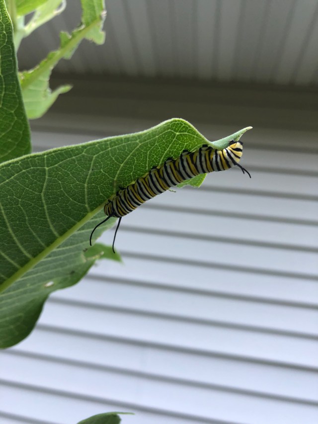 There are some milkweed plants in our back yard. They are actually in our plantings amongst the flowers. They’re not supposed to be there. Most people would pull it out. I wanted it left in. I know milkweed is an important part of Monarch butterflies’ habitat. I counted 15 caterpillars the other day. They are all different sizes and stages. The one in the picture is about the size of my little finger. They will eat up all of the leaves and drop many droppings. They haven’t created their cocoons or chrysalis yet. They aren’t yet butterflies, but I know they will be.