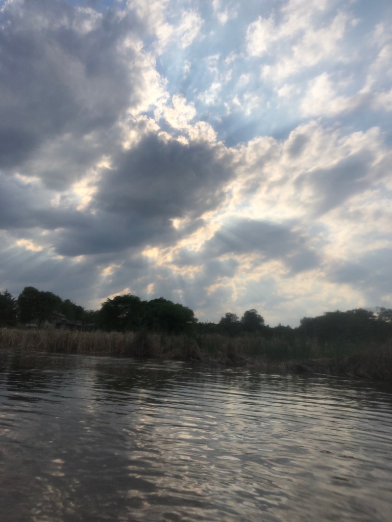 This was the view from my floating raft Monday night. The sun beams peeked through the clouds as we floated down the river. The clouds gave a reprieve from the 92 degree day. The cool, clear water felt refreshing as we made our way down the shallow river among the turtles, muskrats and ducks. It was a peaceful night, and a baby step towards being around others.