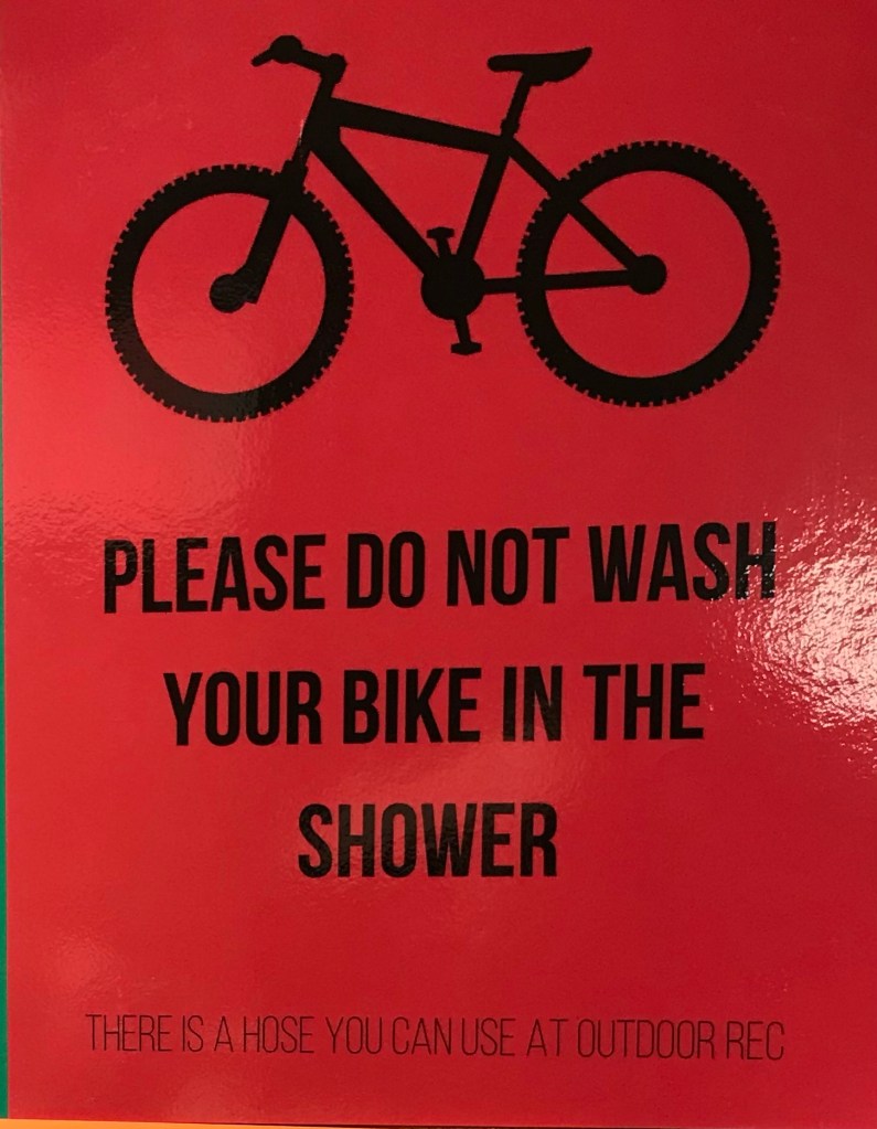 The room is pretty small and has seen a better day. I’m thankful he is in an actual room and not a temporary arrangement like some students. We set up the loft, put down some carpet & started putting things away. He took care of his clothes and soon realized he probably brought too much. (Fewer $2 laundry loads I guess?!) He happens to be right across from the bathroom. My husband went in there and snapped a pic of the bulletin board. “Please do not wash your bike in the shower.” Not even making that up… it’s a laminated poster…. because someone must have done it before. I will always remember one of the rules from my college handbook I found amazing was “do not loft a water bed”… because someone must have. Can you imagine the mess that must have made??