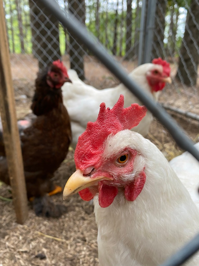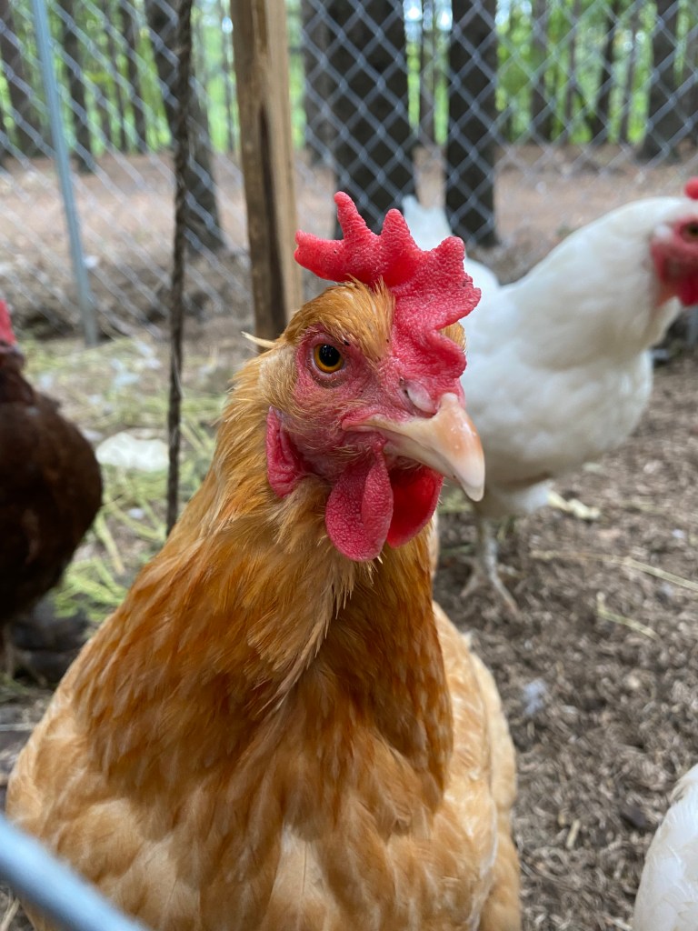 This is Noodle chicken. Pepper is behind her and Daisy is in the back. They are part of the flock of nine hens at our farm. Noodle is wondering why I’m taking pictures of her. Pepper is trying to grow her feathers back. Daisy is annoyed there aren’t more treats. Chickens are funny. They can’t smile but they have a bunch of different cluck noises and expressions. So far, it seems there is a cluck noise when they lay eggs (called the “egg song”), a different cluck when there is danger, a cluck indicating something exciting (like a frog), a cluck when there are treats, a cluck when they see me, a cluck when they are determining “pecking order,” a cluck in the morning and a different one at night. Chicken personalities… who would have thought?