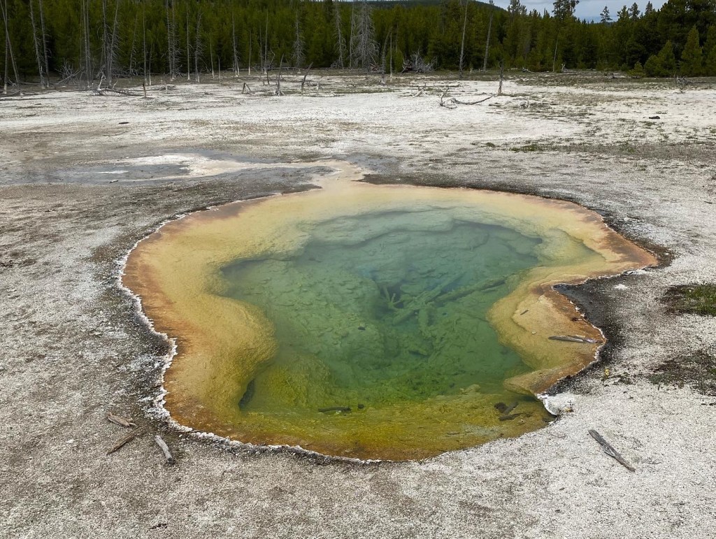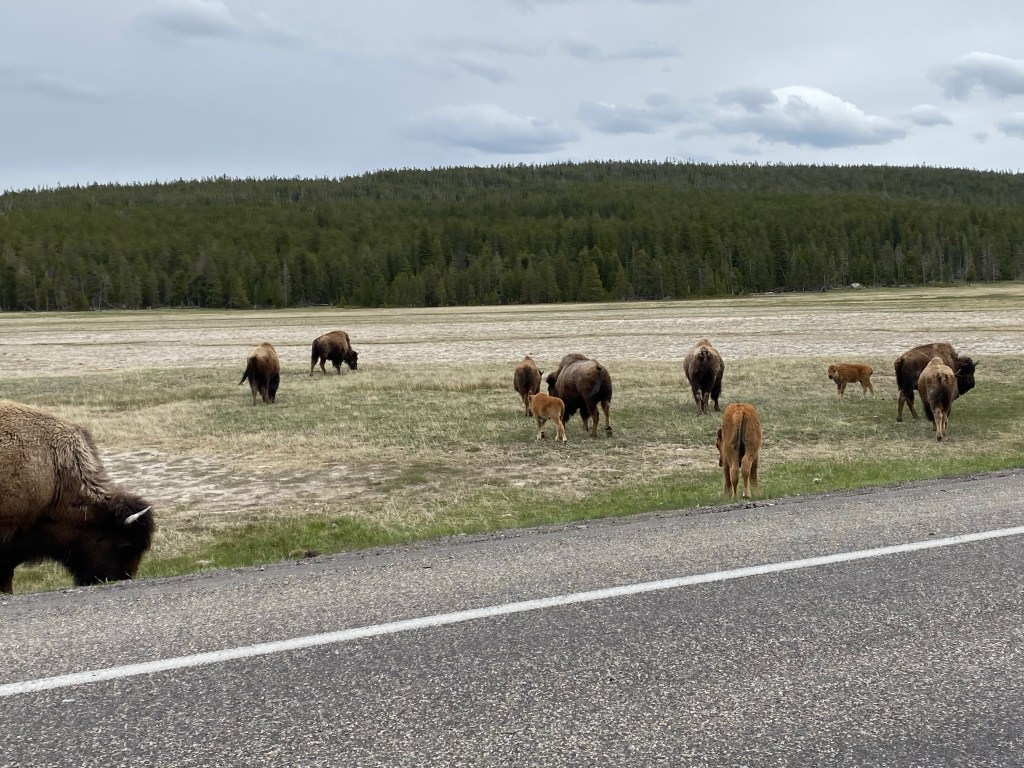 Saturday we made our way to Yellowstone National Park. We saw some elk, antelope, maybe a bear & lots of bison. The last time we were there, it was winter – so it was great to see everything lush and green. They’ve had more rain than normal, so the rivers were flowing rapidly and the grass was getting long. While Dallas and Cameron fished, Myles and I checked out the geysers and hot springs. We had little to no internet or cell service – it was perfect (except for trying to contact the fishermen who had wandered up stream). A day to disconnect and reconnect with nature. Despite someone getting thrown in the air by a bison recently, people still walked way too close to them to get a photo. Their heads are large & strong and they can run 35 mph. “Do not pet the fluffy cows!” And this time of year, there were a bunch of bison calves, so the moms were extra protective.