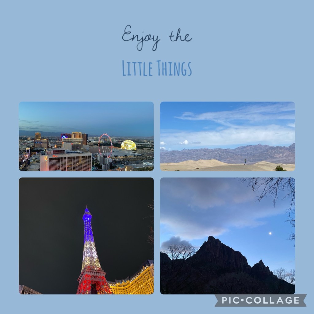 Last week, we went on a family vacation. It was spring break for our son and a pause between school activities, so the time was right. I didn’t track how many miles we put on the rental car, but we walked 25-30,000 steps per day. We had great weather despite the forecast and only had rain one day. We went through 4 states: Nevada, Utah, California and Arizona…3 different hotels… 2 time zones, 2 national parks and 1 state park. We didn’t get lost, or at least not so lost that we couldn’t find our way back.