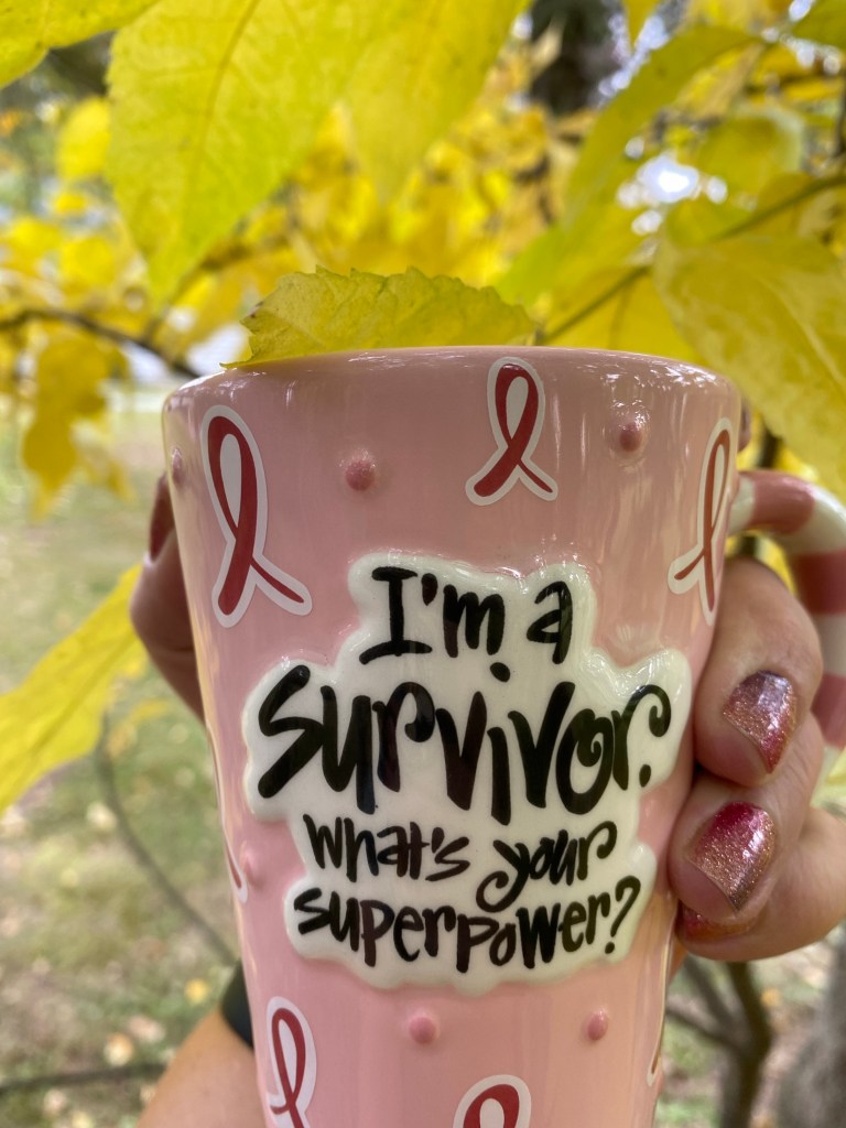 It’s officially October, and the fall leaves are in full display in central MN. October is also breast cancer awareness month. This became extra meaningful for me after my cancer diagnosis & treatment. I recently got this mug as a gift from an aunt of mine. I chose to have pink sparkle nails this month too! I probably won’t wear pink every day since I work from home.